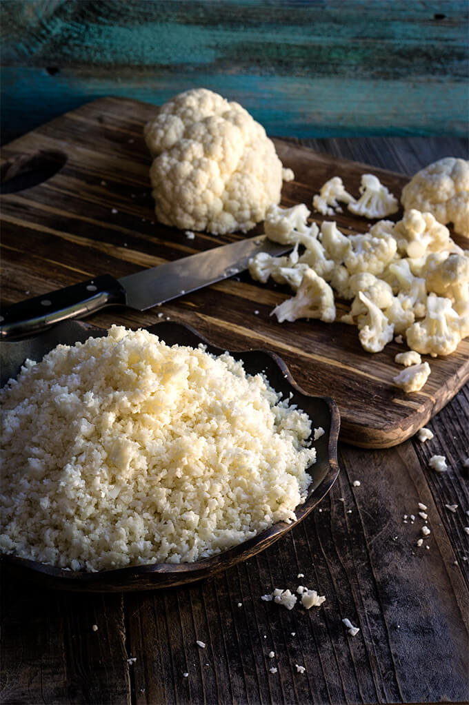 - 4 cups raw cauliflower, 'riced' in a food processor