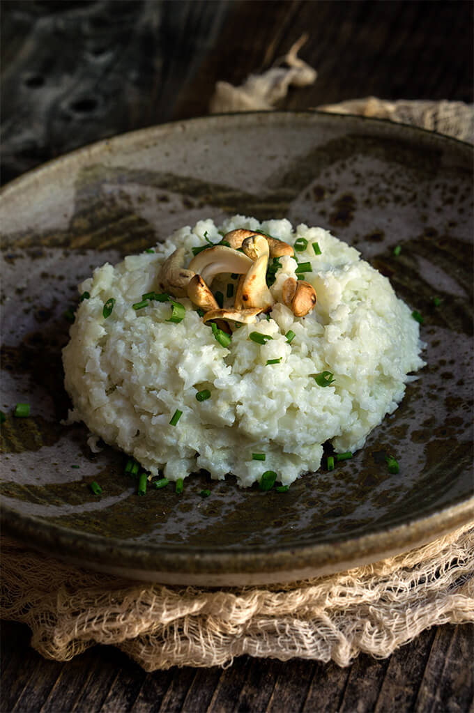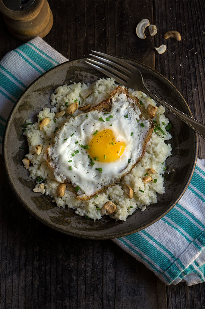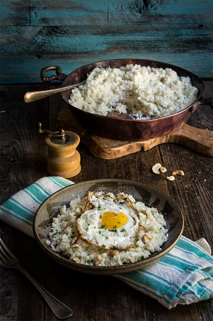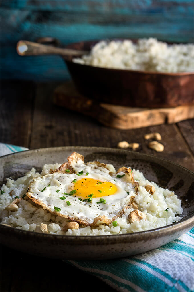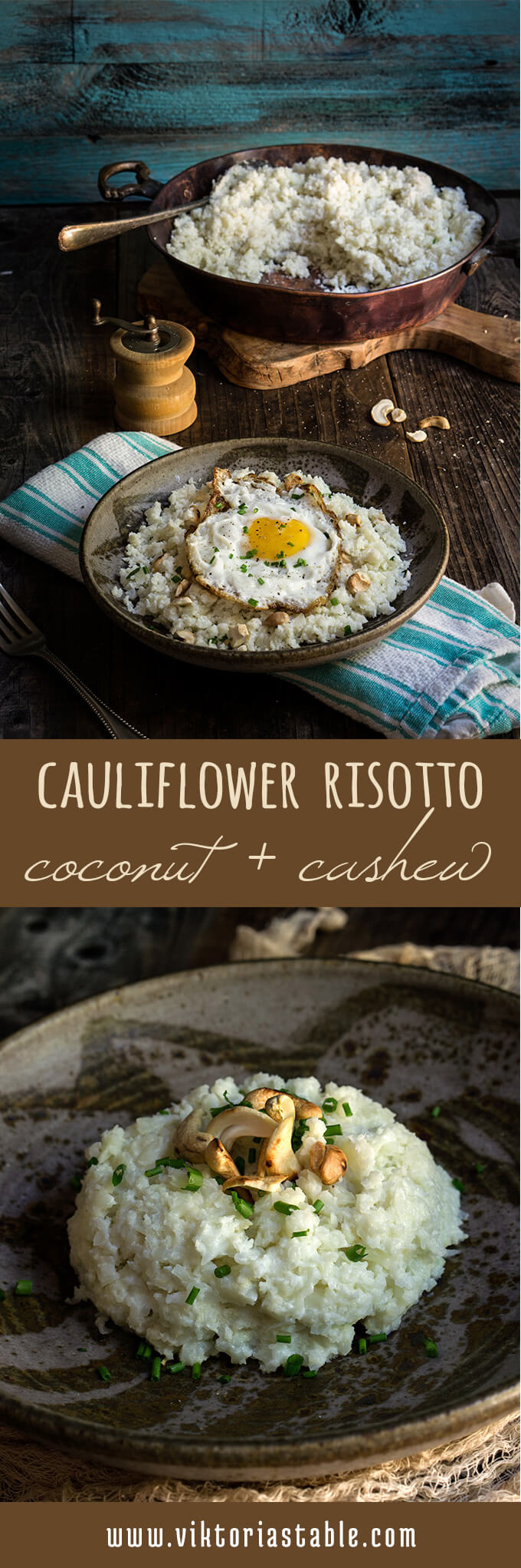 In this recipe, the cauliflower substitutes for Arborio rice, and it does the job pretty well. You end up with a creamy rice-like texture that is nothing short of amazing. Not to mention how quick and healthy it is. It really is just cauliflower, sauteed in coconut oil, coconut milk and garlic, but believe me, it tastes like a fancy meal. To complement the flavors and add some crunch, I sprinkled some toasted salty cashew nuts on top.