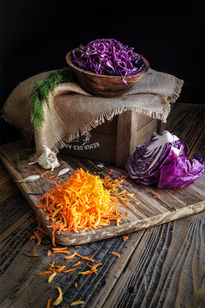 It’s a vitamin bomb, with all the different rainbow-colored vegetables. I think it’s not quite accidental that nature gives us cabbages, broccoli, cauliflower, and brussels sprouts during the cold months, as all these cruciferous veggies are the perfect natural antibiotic, and immune system booster. Eating them 4-5 times a week is optimal, especially now. This salad makes it super easy to consume large quantities of one of these – the cabbage – green, purple, or a mix of both.