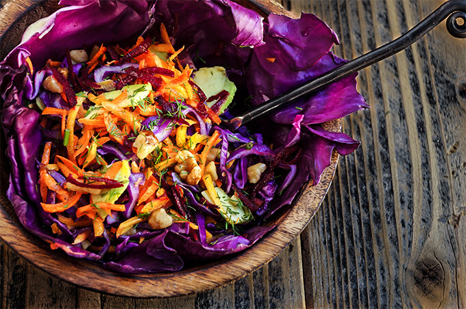 The humble cabbage is incredibly nutritious – it’s a powerhouse of anti-oxidants, and disease-fighting phytochemicals, and its vitamin C content is even higher than that of oranges. Carrots add a boost of vitamin A, and B, and beets – not only are they packed with minerals and vitamins, but their high iron content has a blood purifying and detoxifying effect. Add to that the natural antibiotic power of garlic, the good fat from avocados, walnuts, and olive oil, and I think you have a superfood salad!