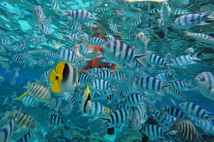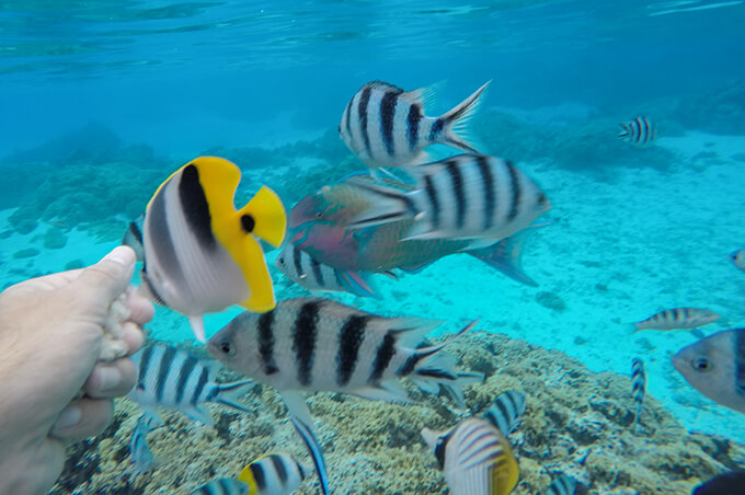 This was the real deal in snorkeling! Our first stop was the famous Coral Gardens. Expecting to see a view similar to the one on Vahine, I was blown away by this stunning underwater world! Crystal clear water that ran a good 10-14 yards deep, and thousands of fish (so may we could hardly see each other), all around us, nibbling bread from our hands, like birds. We were literally swimming in a giant aquarium. We were actually just floating, jaw dropped, mesmerized by the view.