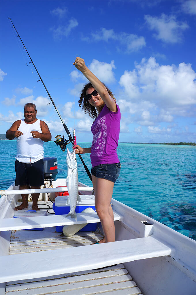 Shortly after breakfast, we started on a 2-hour, fishing excursion in the lagoon. This was our first experience with trolling – a fishing method where the fishing line is drawn through the water, while the boat slowly moves. We’ve been circling around the lagoon for an hour, holding out our rods, and already beginning to doubt that we were ever going to catch anything. Our doubts grew even bigger when our guide was repeatedly navigating the boat through very shallow water – 2-3 feet deep. Apparently though, he knew what he was doing, because all of a sudden I felt a strong tug at the line, and to my amazement pulled out a giant (in my modest fishing experience it was giant) barracuda!