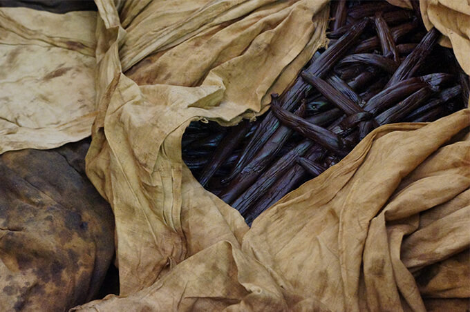 After the beans are picked (they look like long green beans), they are left to dry and ferment in the sun during the day, and wrapped up and put in sweat boxes at night. This process continues for three months at least.