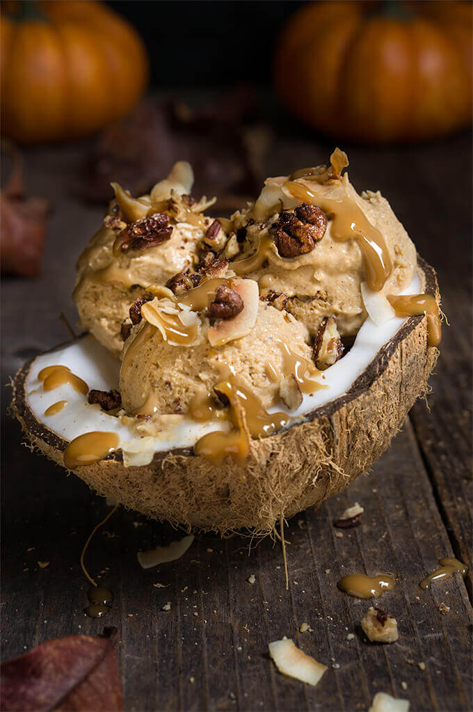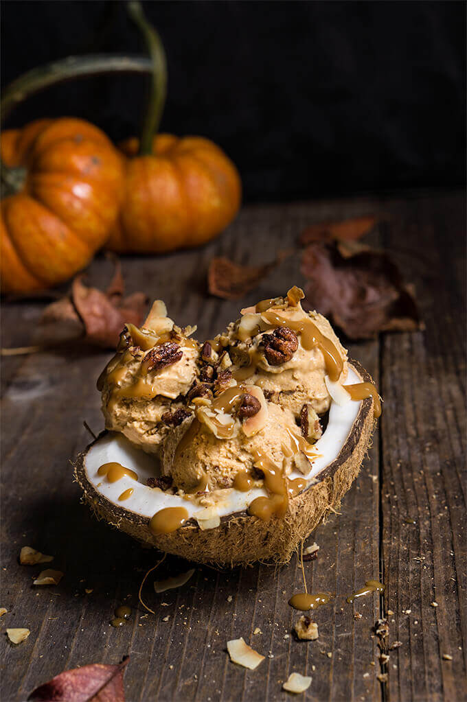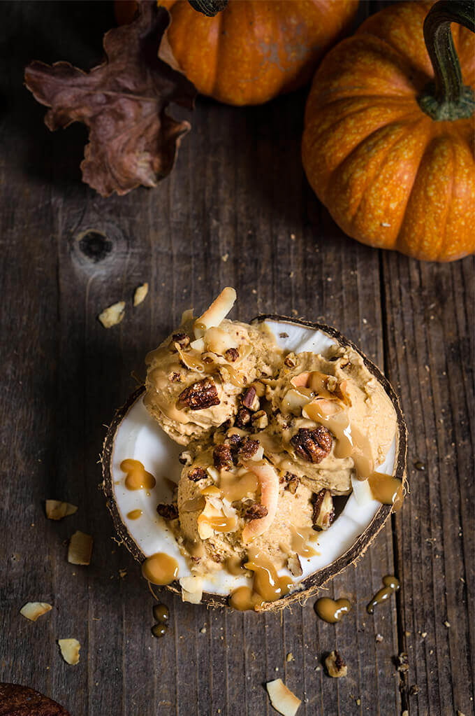 Pumpkin ice cream with coconut caramel and praline pecans – 3 ingredients, no-churn, vegan ice cream that’s as creamy and delicious as pumpkin pie, and totally decadent, drizzled with coconut caramel, toasted coconut chips, and maple-spiced praline pecans.