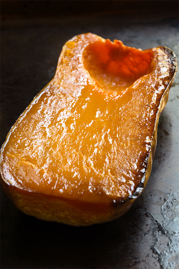 - Flip it over, cut side down, and place in a roasting pan. Roast in a 400° F oven for about 40 minutes, or until it’s super soft, and caramelized at the bottom. No need to peel the squash upfront, as you can easily scoop out the flesh, once it’s roasted.