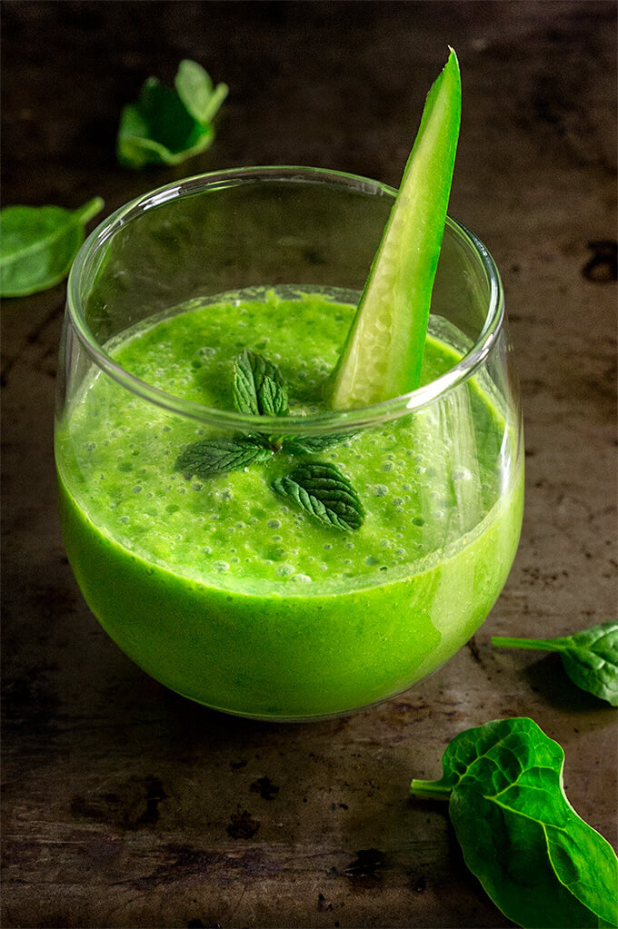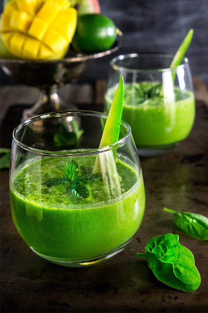 Skinny green smoothie – cucumber, lemon, and mint give this green smoothie a great fresh taste, mango makes it slightly sweet and creamy, and baby spinach provides all the green health benefits.
