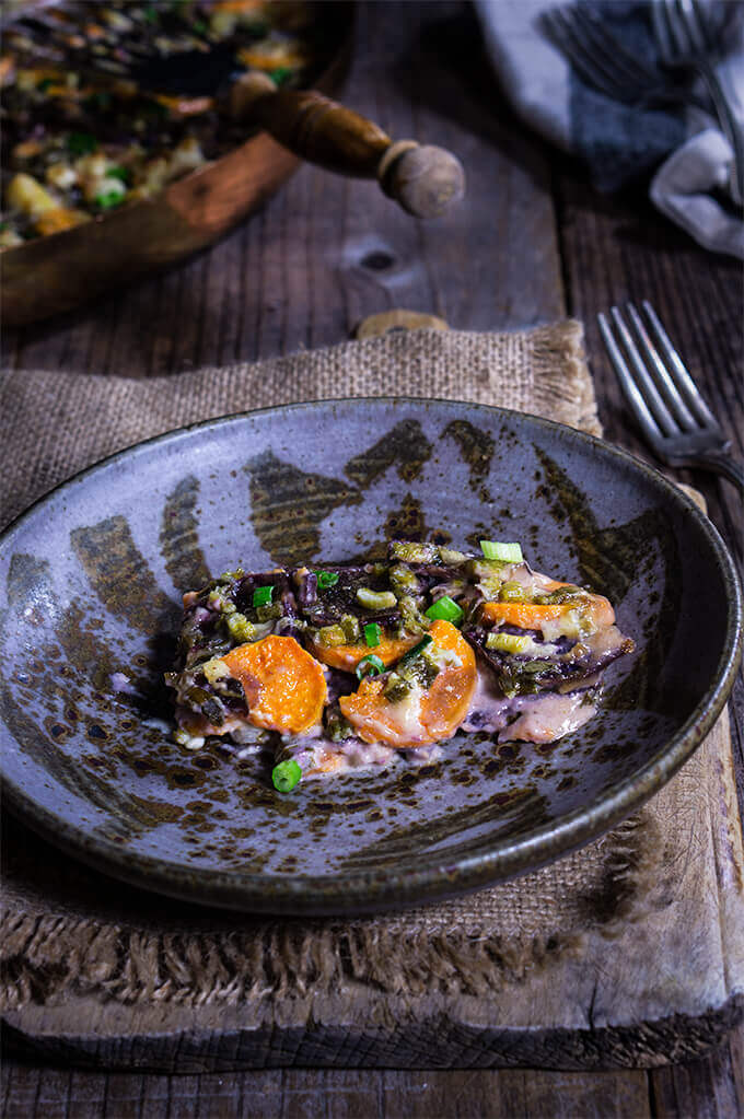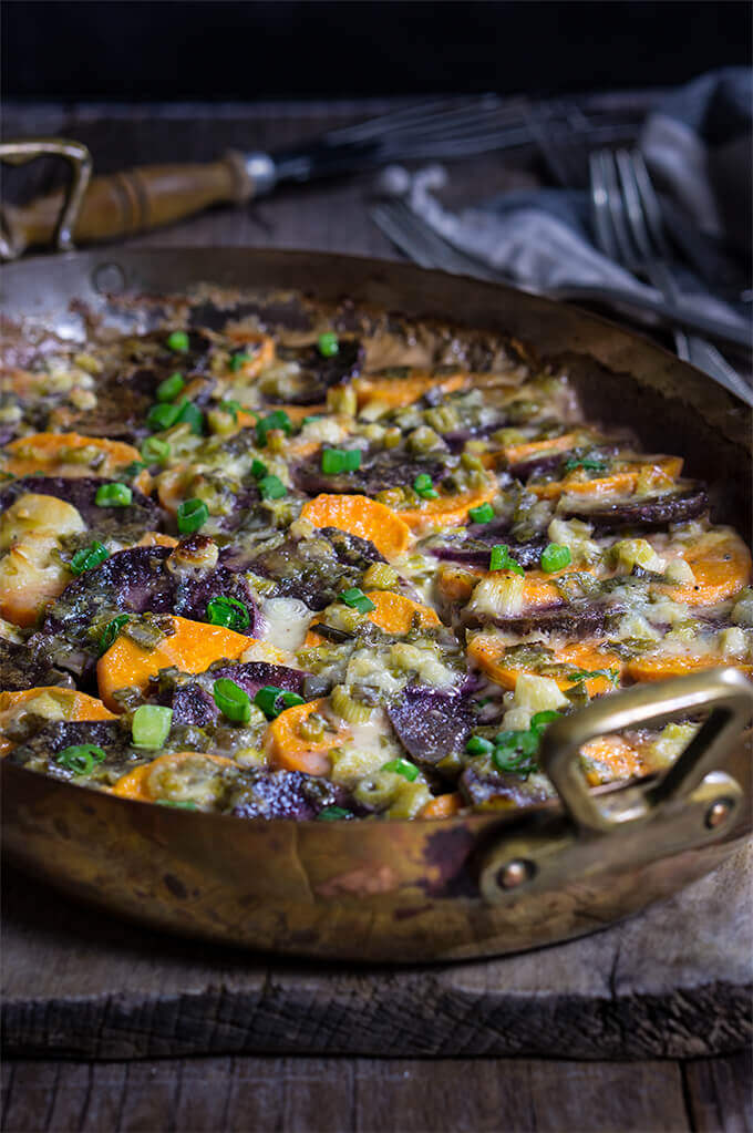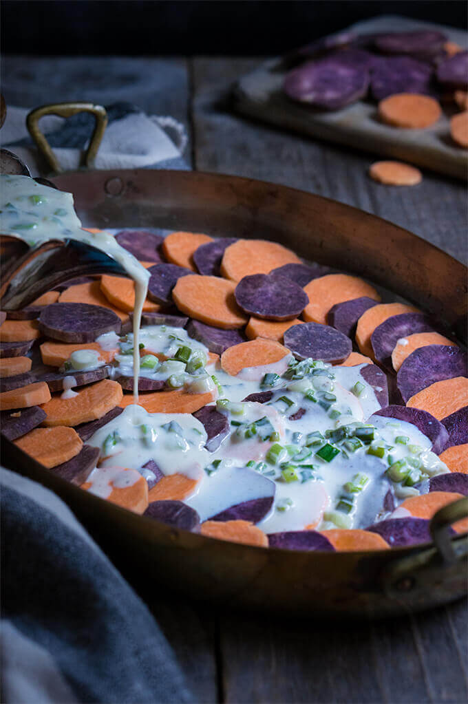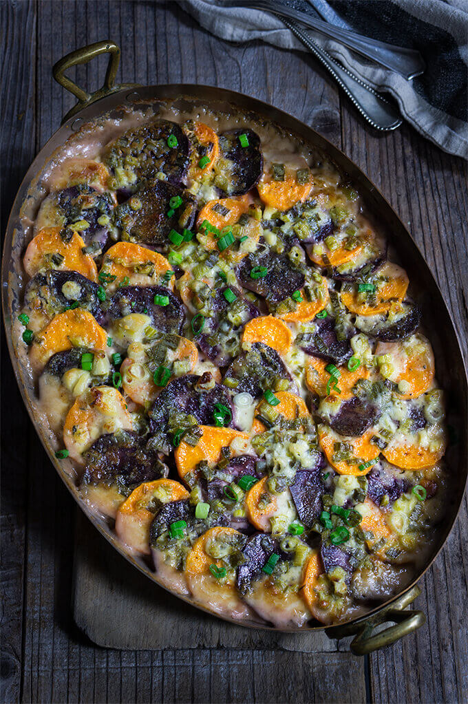 Sweet potato and blue cheese gratin – layers of purple and orange sweet potatoes, melting in a pool of spicy cream, and salty blue cheese – bold contrasting flavors for the perfect balance of sweet and salty.