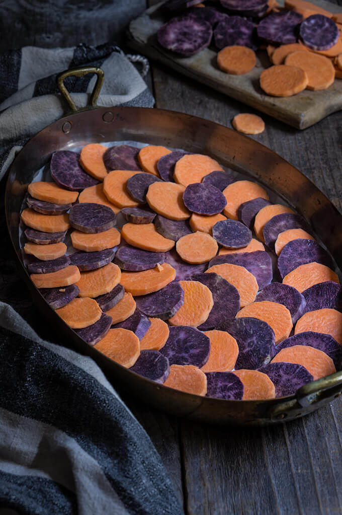 Butter a dish, and arrange the potato slices in a circular pattern, alternating orange and purple slices, and slightly overlapping them.